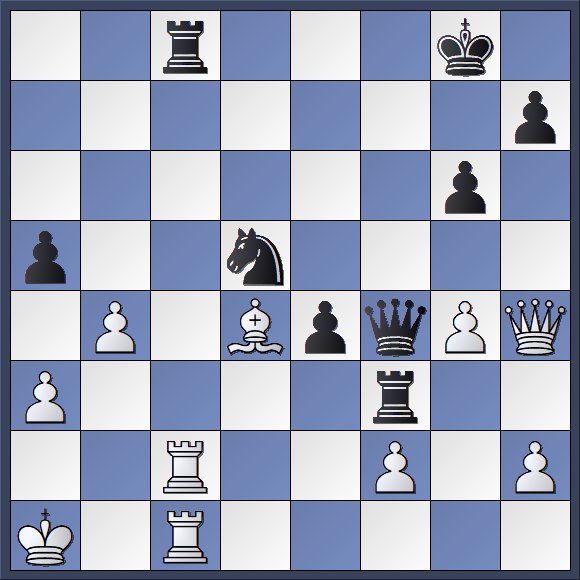 Bei unserer oben genannten letzten Simultanveranstaltung im Oktober 2017 verloren wir erwartungsgemäß an fast allen Brettern – nur dem damals erst neunjährigen Emil Kasims gelang ein Überraschungssieg! Ein besseres Gesamtergebnis verspielte ich damals, obwohl ich mich bis zum 30. Zug von M.+A. Stangl erstaunlich gut gehalten hatte und folgende offene Stellung entstanden war, in der alles möglich zu sein schien:
