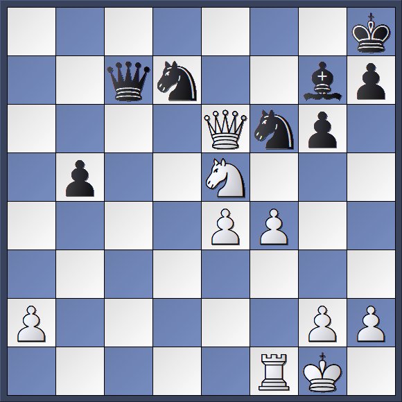 Am 8.12. hatte ich das „erstickte Matt“ vorgestellt und geschrieben, dass dieses in echten Turnierpartien selten vorkommt. Das liegt natürlich auch daran, dass dieses Mattbild vielen fortgeschrittenen Schachspielern bekannt ist und deshalb meist rechtzeitig Gegenmaßnahmen ergriffen werden, z.B. indem ein „Luftloch“ für den König geschaffen wird. Es ist jedoch ein Irrtum zu glauben, dass ein ersticktes Matt lediglich in von vornherein geschlossener Stellung oder der Anfangsphase des Spiels entstehen kann. Die beengte Stellung des Matt zu setzenden Königs wird vielmehr oft durch den Angreifer erst gezielt herbeigeführt. So auch in einer alten Partie von mir, die ich nach längerem Suchen ausgegraben habe. Dort waren nach offenen Schlagabtausch schon viele Figuren vom Brett verschwunden. In der Diagrammstellung unten hatte Schwarz soeben 25. Sb6-d7 ?? gezogen und damit sein Schicksal besiegelt, denn nun gibt es kein Zurück mehr – Weiß setzt in spätestens 4 Zügen Matt.