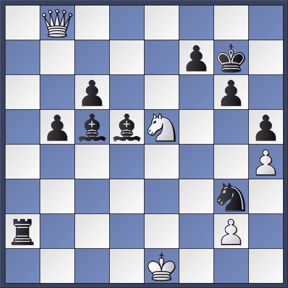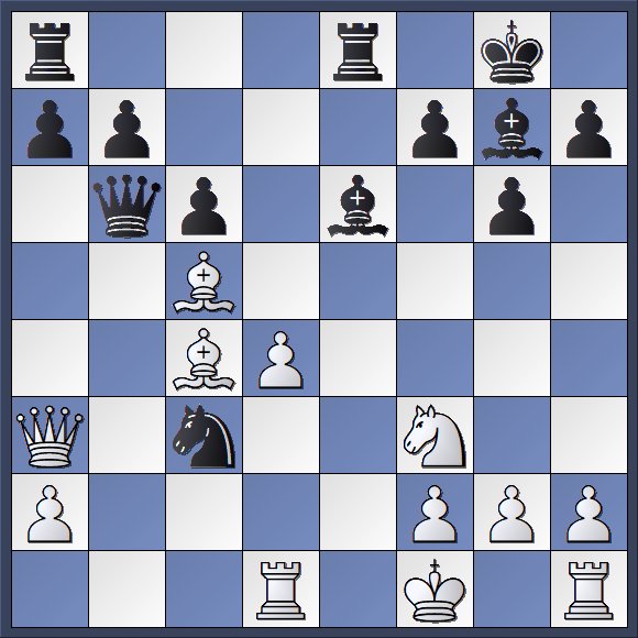 Und falls Weiß statt dessen mit der Dame den Springer auf c3 schlägt, kann die schwarze Dame auf c5 zurückschlagen: 18…Db6xc5, und nach 19. d4xc5 Lxc3 20. Lxe6 Txe6 hätte Schwarz ein gewonnenes Endspiel, mit mindestens einem Mehrbauern, und auch die vereinzelten a- und der c-Bauer von Weiß wären nicht lange überlebensfähig. Noch schlechter wäre 19. Sd2 Lxd4 mit weiterem Bauerngewinn, und auch nach 19. Tc1 Lxc4 20. Dxc4 Dxc4 21. Txc4 Tad8 hat Schwarz ein klar besseres Endspiel und holt sich mit den vereinten Kräften seiner drei Figuren in Kürze auch noch den Bauern d4, weil der weiße Th1 zur spät zur Verteidigung kommt, und der weiße König die e-Linie wegen des Te8 nicht betreten kann.