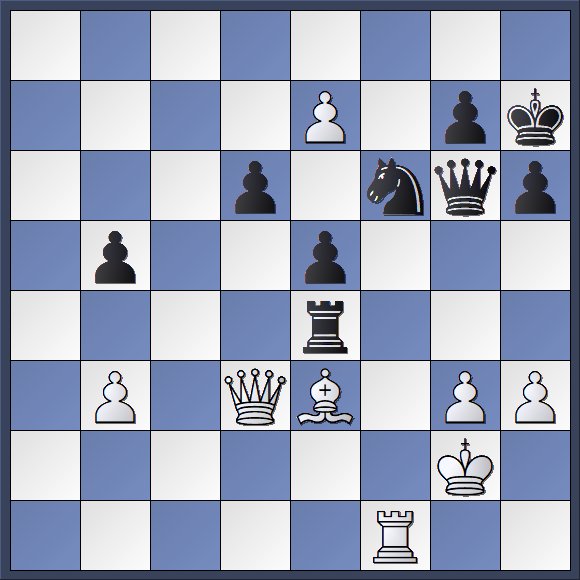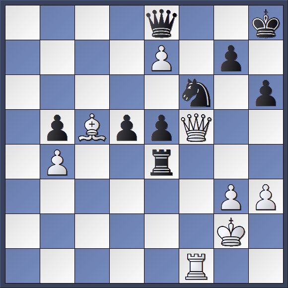 Weiß will sich aber nicht mit einem forcierten Remis zufrieden geben, sondern weiter auf Sieg spielen. Daher folgt in der Partie nun 38. b2-b3. Der schwarze Turm muss wegziehen, er könnte z.B. nach a2 gehen, doch nach 38…Ta2 39. Tf2 Txf2 40. Lxf2 steht Weiß wiederum besser. Borgov tauscht daher nicht seinen starken Turm ab, sondern holt sich wie geplant mit 38..Txe4 den als Stabilitätsanker dienenden weißen Zentrumsbauern ab (falls Schwarz statt dessen mit 38…Sxe3 zugreifen würde, hätte Weiß nach 39. bxa Sxg3 … die gleiche Idee wie oben, wiederum hängt die weiße Dame auf d3, wenn Sxg3 erfolgt, …40.Sf5-e7!! Dxd3 41. Sf8+ Kh8 42. Sfg6+ ein weiteres forciertes Remis durch Zugwiederholung, weil der schwarze König nur noch zwischen h7 und h8 hin- und herziehen kann, wenn er nicht verlieren will).