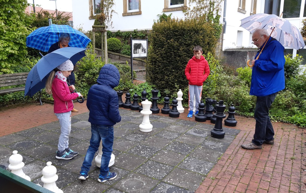 In den Pfingstferien ruhte der Online-Trainingsbetrieb beim SC Kirchseeon, und ich besuchte mit der Familie die Heimat meiner Eltern in Ostercappeln bei Osnabrück. Dort war der VFL gerade mal wieder in die 3. Liga abgestiegen und trifft dort in der nächsten Saison auf die Münchner Löwen, die es auch wieder nicht in die 2. Liga geschafft haben. Womit ich aber nicht gerechnet hatte: In Ostercappeln wurde Schach gespielt – mit echten Figuren, in der Öffentlichkeit, von mindestens drei Generationen, Mädchen und Jungen, Müttern und Vätern, und dem lokalen „Godfather of Chess“ höchstpersönlich – Hans-Ludwig Schwedhelm, ehemaliger Schullehrer und Gründer der ersten Schach-AG dieses kleinen Ortes, aus der später eine starkes Jugendteam erwuchs, das in den 80er-Jahren bis in die Bezirksliga Osnabrück-Emsland aufstieg.